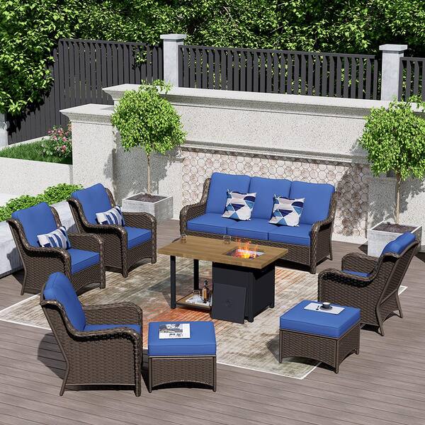 Joyoung Brown 8-Piece Wicker Outdoor Patio Fire Pit Table Conversation Seating Set with Navy Blue Cushions