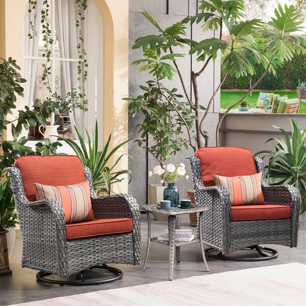 Joyoung Gray 3-Piece Wicker Outdoor Patio Conversation Set with Orange Red Cushions and Swivel Rocking Chairs