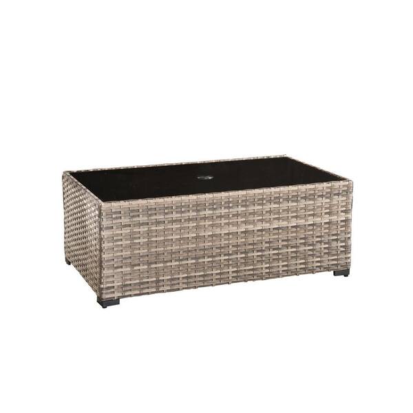 MISOGRS Outdoor PE Wicker Coffee Table Rectangle Tempered Glass Table with Umbrella Hole