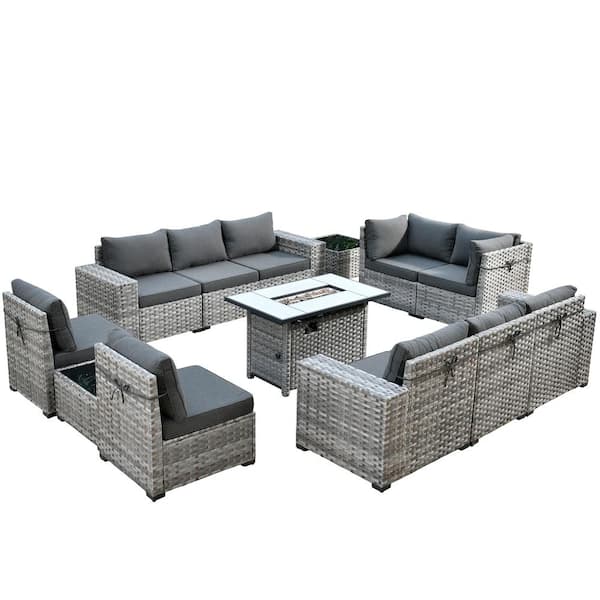 Marvel Gray 13-Piece Wicker Wide Arm Patio Fire Pit Conversation Set with Black Cushions