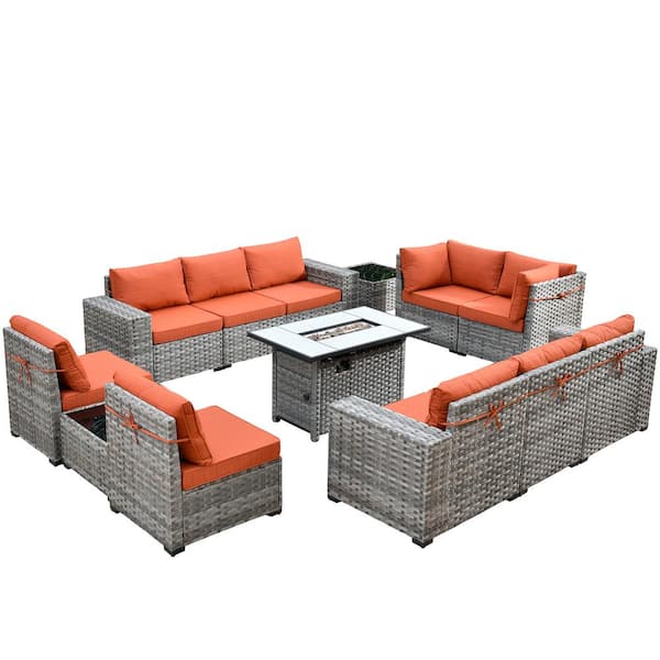 Marvel Gray 13-Piece Wicker Wide Arm Patio Fire Pit Conversation Set with Orange Red Cushions