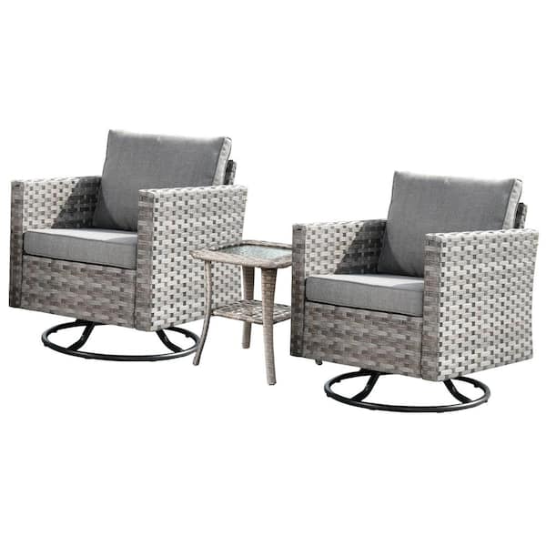 Marvel Gray 3-Piece Wicker Wide Arm Patio Conversation Set with Dark Gray Cushions and Swivel Rocking Chairs