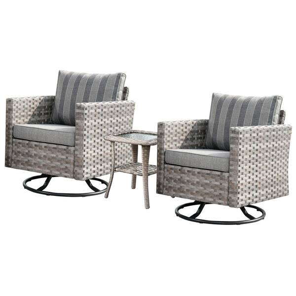 Marvel Gray 3-Piece Wicker Wide Arm Patio Conversation Set with Striped Gray Cushions and Swivel Rocking Chairs