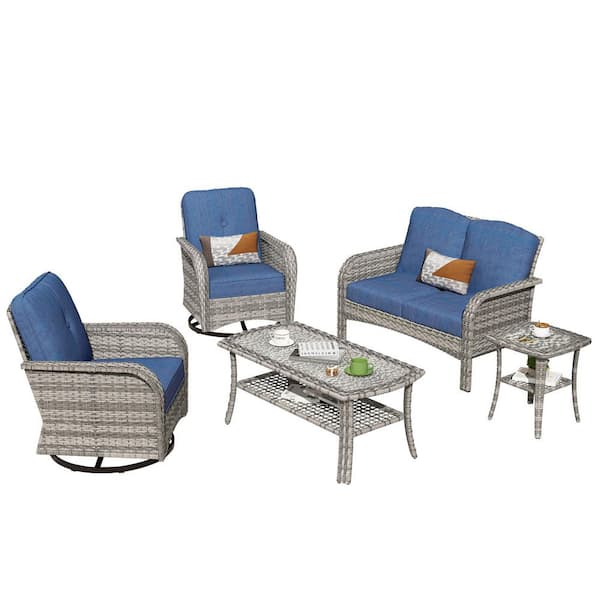 Mejy Gray 5-Piece Wicker Patio Conversation Set with Denim Blue Cushions and Swivel Chairs