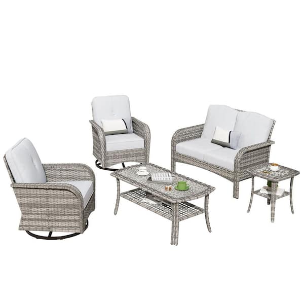 Mejy Gray 5-Piece Wicker Patio Conversation Set with Gray Cushions and Swivel Chairs