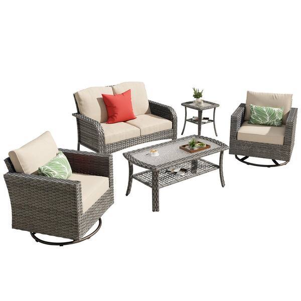 Missisi Gray 5-Piece Wicker Patio Conversation Set with Beige Cushions and Swivel Chairs