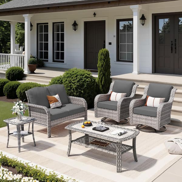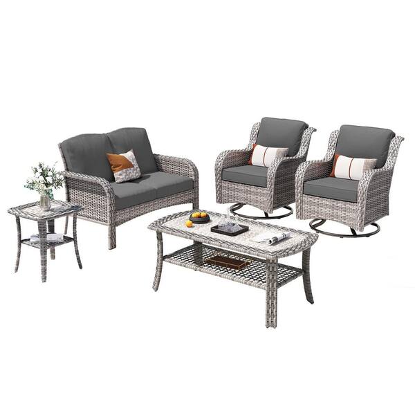Miziisy Gray 5-Piece Wicker Patio Conversation Set with Black Cushions and Swivel Chairs