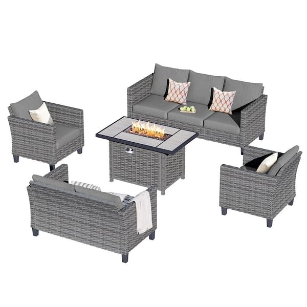 New Star Gray 5-Piece Wicker Patio Rectangle Fire Pit Conversation Seating Set with Dark Gray Cushions