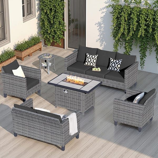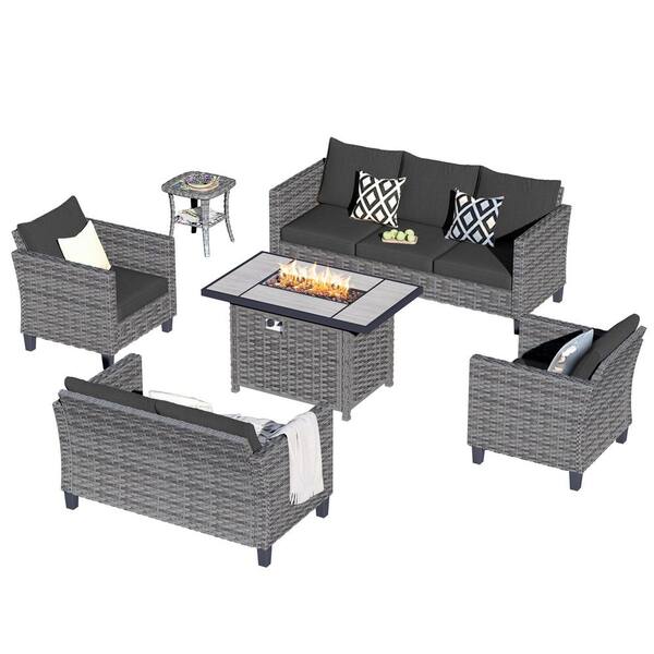 New Star Gray 6-Piece Wicker Patio Rectangle Fire Pit Conversation Seating Set with Black Cushions