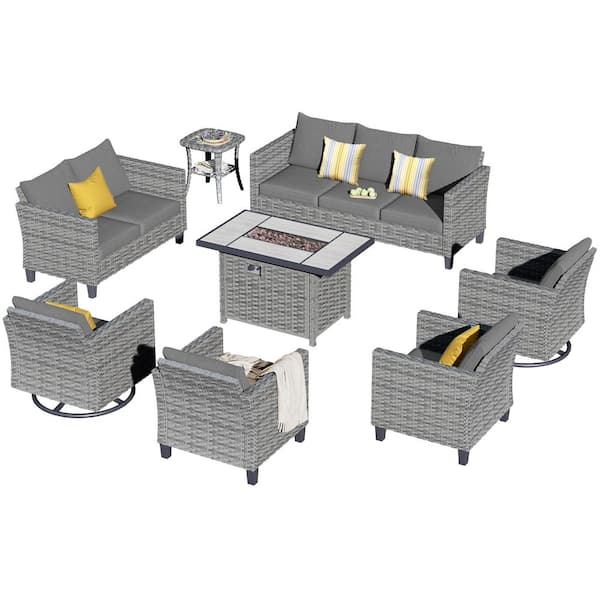 New Star Gray 8-Piece Wicker Patio Rectangle Fire Pit Conversation Seating Set with Dark Gray Cushions and Swivel Chairs