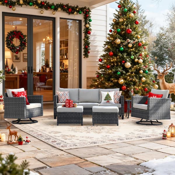 New Vultros Gray 6-Piece Wicker Outdoor Patio Conversation Set with Beige Cushions and Swivel Rocking Chairs