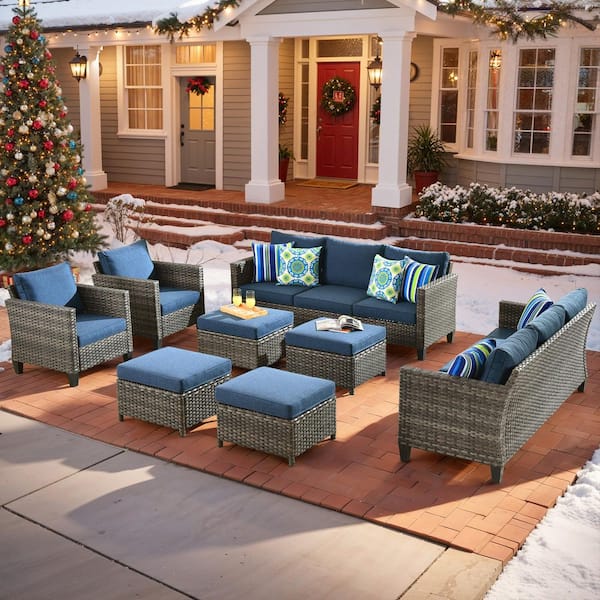 New Vultros Gray 8-Piece Wicker Outdoor Patio Conversation Seating Set with Blue Cushions