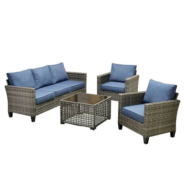 Nvelyn Gray 4-Piece Wicker Patio Conversation Set with Denim Blue Cushions and Coffee Table