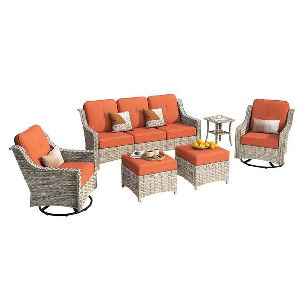 Palffy Gray 6-Piece Wicker Outdoor Patio Conversation Set with Bold-stripe Orange Red Cushions and Swivel Rocking Chairs