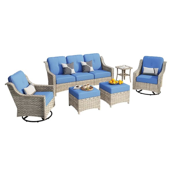 Palffy Gray 6-Piece Wicker Outdoor Patio Conversation Set with Diamond Blue Cushions and Swivel Rocking Chairs