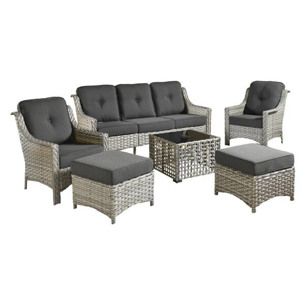 Palffy Gray 6-Piece Wicker Patio Conversation Seating Set with Black Cushions and Coffee Table