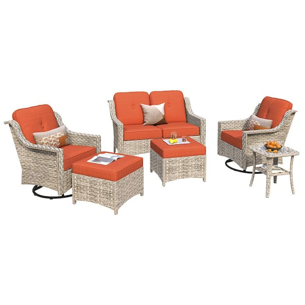Palffy Gray 6-Piece Wicker Patio Conversation Seating Set with Orange Red Cushions and Swivel Rocking Chairs