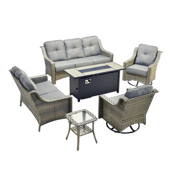 Palffy Gray 6-Piece Wicker Patio Rectangle Fire Pit Conversation Set with Dark Gray Cushions and Swivel Chairs