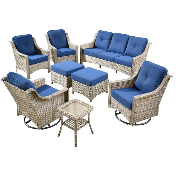 Palffy Gray 8-Piece Wicker Patio Conversation Seating Set with Navy Blue Cushions and Swivel Rocking Chairs