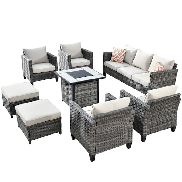 Positano Gray 8-Piece Wicker Patio Fire Pit Conversation Set with Beige Cushions