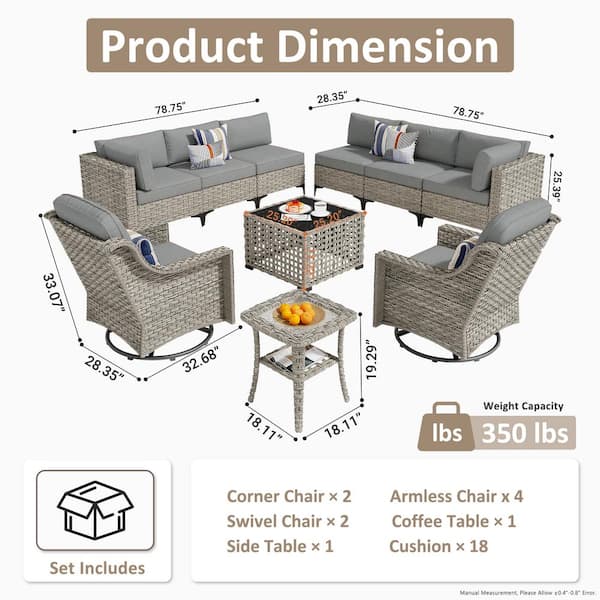 Supery Gray 10-Piece Wicker Patio Conversation Set with Dark Gray Cushions and Swivel Rocking Chairs