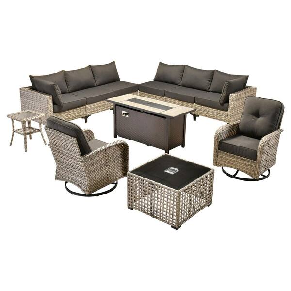 Supery Gray 11-Piece Wicker 54 in. Rectangle Fire Pit Patio Conversation Set with Black Cushions and Swivel Chairs