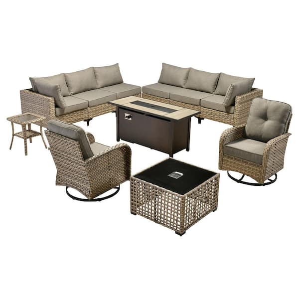 Supery Gray 11-Piece Wicker 54 in. Rectangle Fire Pit Patio Conversation Set with Dark Gray Cushions and Swivel Chairs