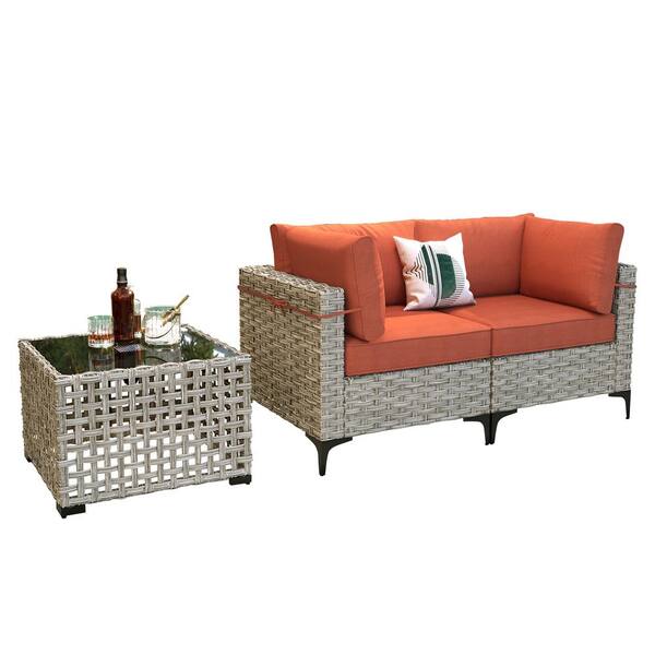 Supery Gray 3-Piece Wicker Patio Conversation Set with Bold-Stripe Orange Red Cushions and Coffee Table