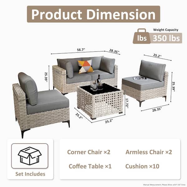 Supery Gray 5-Piece Wicker Patio Conversation Seating Set with Dark Gray Cushions and Coffee Table