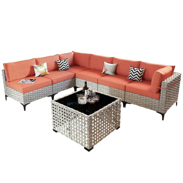 Supery Gray 7-Piece Wicker Patio Conversation Seating Set with Bold-Stripe Orange Red Cushions and Coffee Table