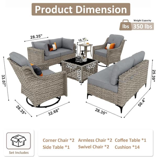Supery Gray 8-Piece Wicker Patio Conversation Set with Dark Gray Cushions and Swivel Rocking Chairs