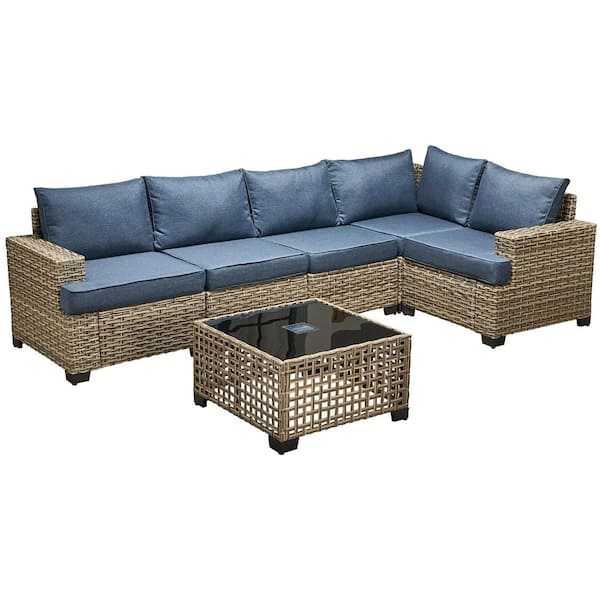 Tiberte Gray 6-Piece Wicker Patio Conversation Seating Set with Denim Blue Cushions
