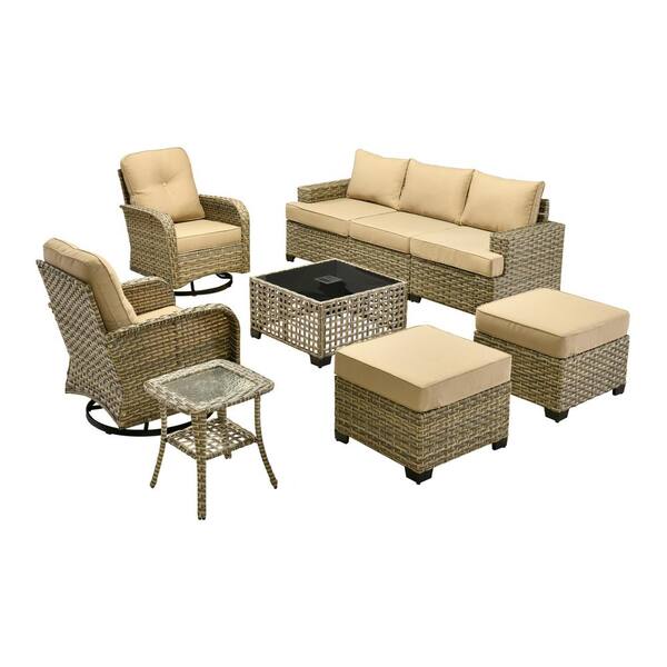 Tiberte Gray 9-Piece Wicker Patio Conversation Seating Set with Beige Cushions and Swivel Chairs