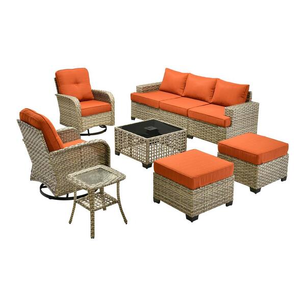 Tiberte Gray 9-Piece Wicker Patio Conversation Seating Set with Bold-stripe Orange Red Cushions and Swivel Chairs