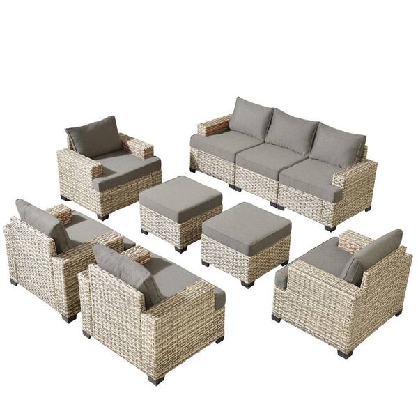 Tiberte Gray 9-Piece Wicker Patio Conversation Seating Set with Dark Gray Cushions