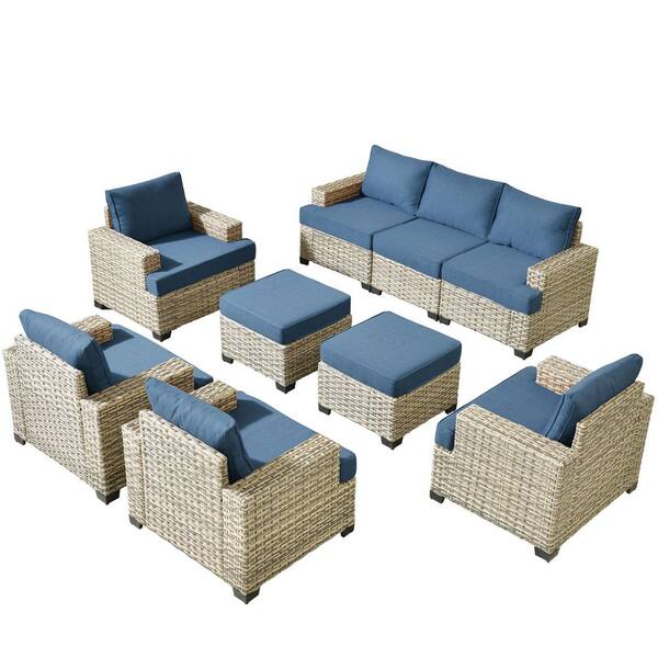 Tiberte Gray 9-Piece Wicker Patio Conversation Seating Set with Denim Blue Cushions