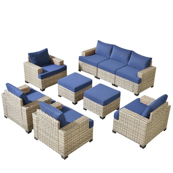 Tiberte Gray 9-Piece Wicker Patio Conversation Seating Set with Navy Blue Cushions