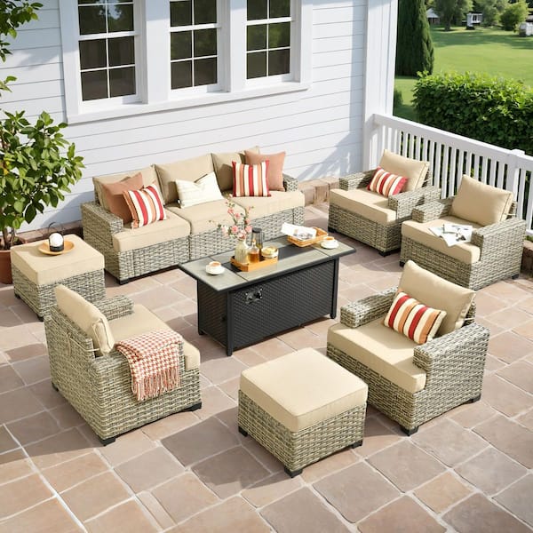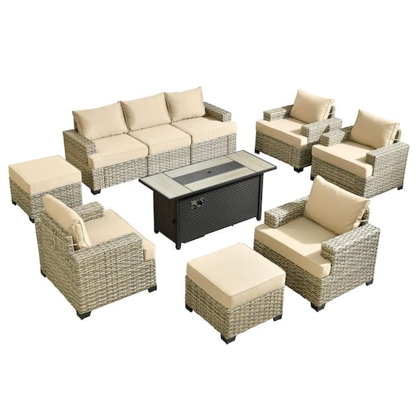 Tiberty Gray 10-Piece Wicker Patio 54 in. Rectangle Fire Pit Conversation Set with Beige Cushions
