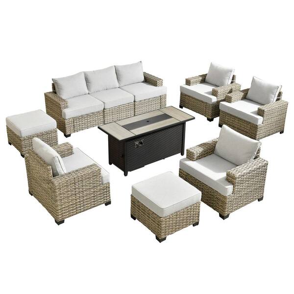 Tiberty Gray 10-Piece Wicker Patio 54 in. Rectangle Fire Pit Conversation Set with Gray Cushions