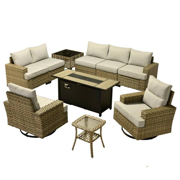 Tiberty Gray 10-Piece Wicker Patio 54 in. Rectangle Fire Pit Conversation Set with Gray Cushions and Swivel Chairs