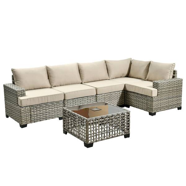 Tiberty Gray 6-Piece Wicker Patio Conversation Seating Set with Beige Cushions