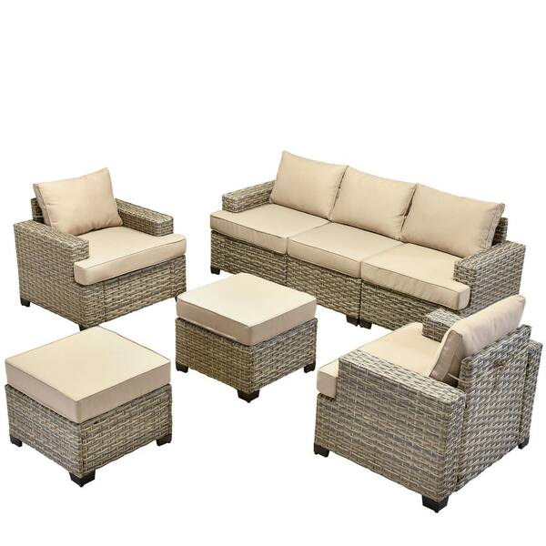 Tiberty Gray 7-Piece Wicker Patio Conversation Seating Set with Beige Cushions