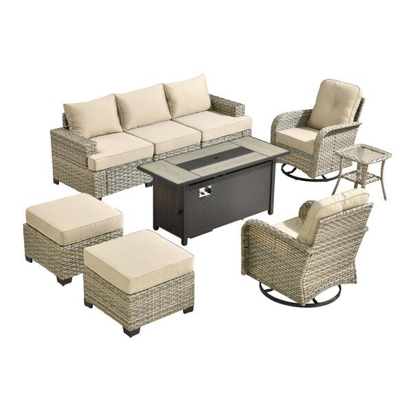 Tiberty Gray 9-Piece Wicker Patio Rectangle Fire Pit Conversation Set with Beige Cushions and Swivel Chairs