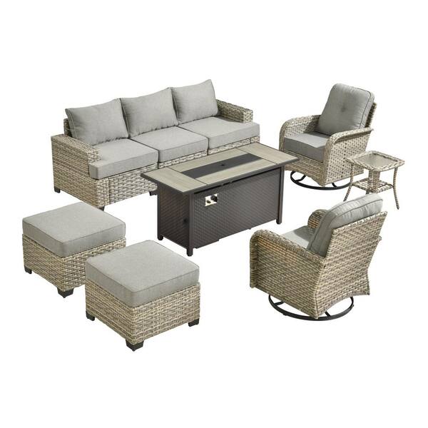 Tiberty Gray 9-Piece Wicker Patio Rectangle Fire Pit Conversation Set with Dark Gray Cushions and Swivel Chairs