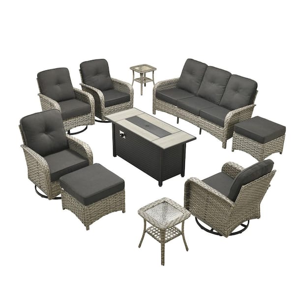 Vinceny Gray 10-Piece Wicker Patio 54"Rectangle Fire Pit Conversation Set with Black Cushions and Swivel Chairs