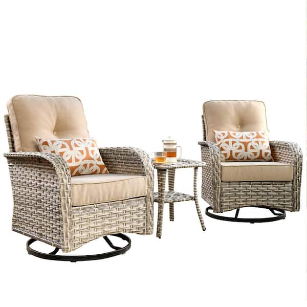 Vinceny Gray 3-Piece Wicker Patio Conversation Seating Set with Beige Cushions and Swivel Chairs