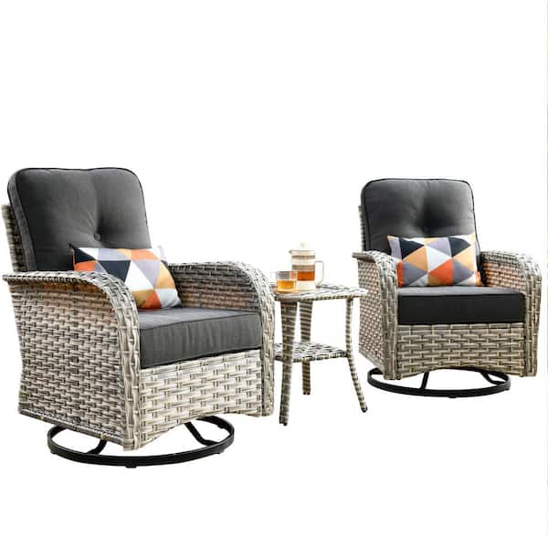 Vinceny Gray 3-Piece Wicker Patio Conversation Seating Set with Black Cushions and Swivel Chairs