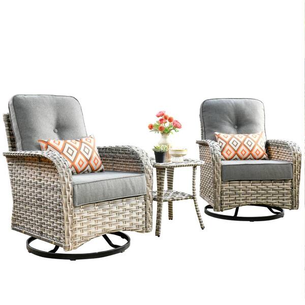 Vinceny Gray 3-Piece Wicker Patio Conversation Seating Set with Dark Gray Cushions and Swivel Chairs