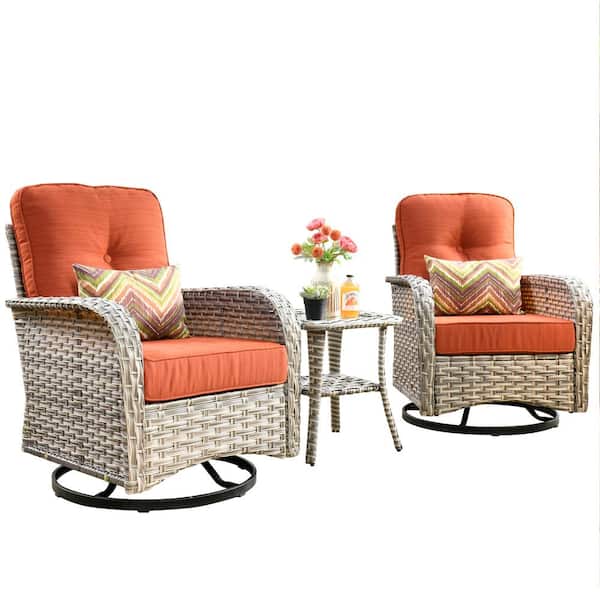 Vinceny Gray 3-Piece Wicker Patio Conversation Seating Set with Orange Red Cushions and Swivel Chairs