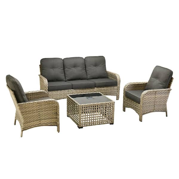 Vinceny Gray 4-Piece Wicker Patio Conversation Set with Black Cushions and Coffee Table